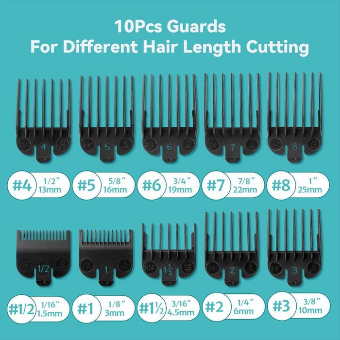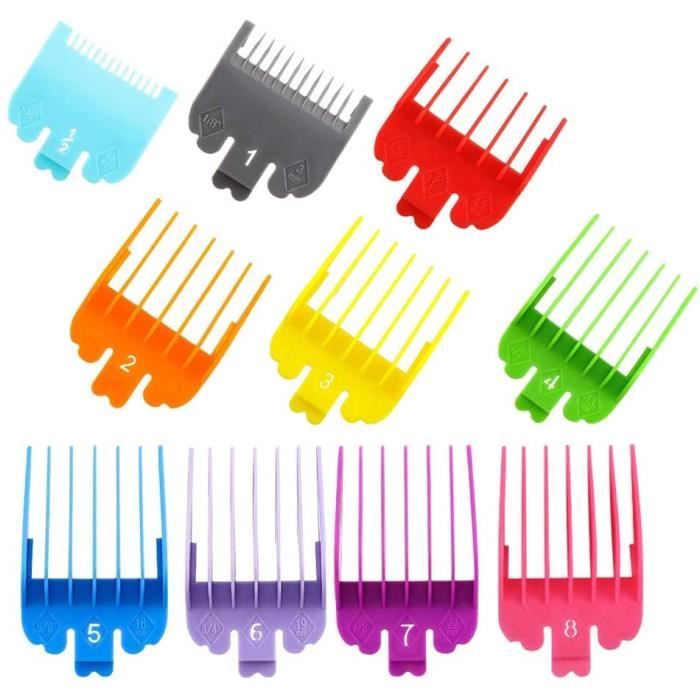 Ce lot de 8 guides de coupe (aussi appelés sabots ou peignes) est essentiel si vous faites vos coupes de cheveux vous-même ou si vous êtes coiffeur débutant. Ils sont compatibles avec la plupart des tondeuses Wahl (et souvent d'autres marques similaires). Chaque guide se clipse sur la tête de la tondeuse et permet de régler la longueur de coupe souhaitée, pour un résultat uniforme. Le lot comprend les tailles les plus courantes : 1/8\ (≈3 mm), 1/4\ (≈6 mm), 3/8\ (≈9.5 mm), 1/2\ (≈13 mm), 5/8\ (≈16 mm), 3/4\ (≈19 mm), 7/8\ (≈22 mm) et 2.5 cm. Vous avez ainsi toute la gamme pour faire des dégradés, des coupes militaires, ou simplement entretenir une longueur. Ils sont en plastique résistant, de bonne qualité. Un accessoire très pratique pour compléter votre tondeuse et élargir ses possibilités de coupe sans risque de faire des erreurs.
